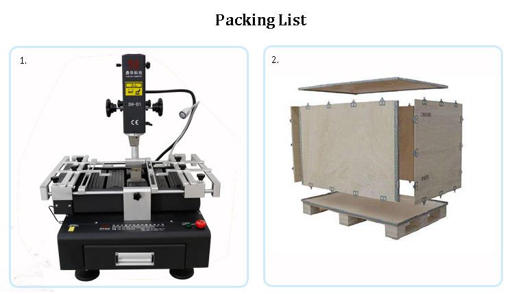 Stanica za preradu DH-D1 BGA je najpopularnija BGA prerađivačka stanica s kontrolom zaslona osjetljivog na dodir, 3 pojedinačne zone, 6 donjih grijača s podesivom visinom, programabilnim gornjim / donjim grijanjem, sustavom kamera visoke rezolucije 50X, 3 termokupi za profiliranje u stvarnom vremenu.